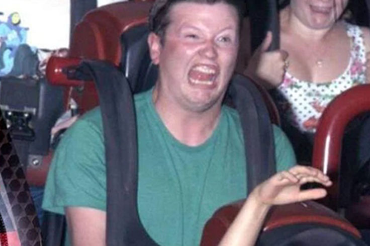 The sheer terror and exhilaration of the roller coaster ride are perfectly encapsulated in this photo. A young man in the foreground displays an expression of pure panic, his mouth wide open and eyes squeezed shut, capturing the essence of thrill-seeking at its finest. It’s a face of unforgettable fear.