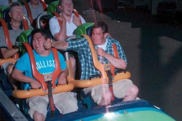 Nothing says “friendship” like an unexpected punch to the face on a roller coaster! As the ride hits a high-speed turn, one rider’s fist flies, landing squarely on his buddy’s cheek. The expressions range from shock to hilarity, perfectly capturing the chaos and fun of the moment. It’s a friendly jab, delivered at the worst possible time.