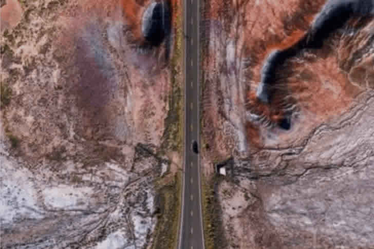 アメリカのユタ州、モアブ近くの荒野を走る一本の道路が、まるで地球の顔を切り裂くように伸びています。この場所は「ライオンズ・バック」と呼ばれ、空中から見ると巨大な顔のような地形が現れます。赤茶色の岩肌と白い堆積物が織りなすコントラストは、自然が描いた壮大なアート作品のようです。道路を走る小さな車が、地形のスケールの大きさを際立たせ、まるで別の惑星に迷い込んだかのような錯覚を与えます。