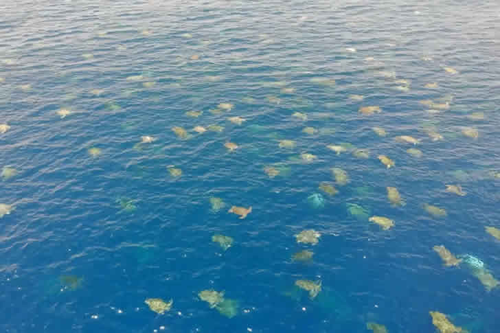 このウミガメたちは、産卵や餌を求めて長距離を移動する旅の途中かもしれません。群れで泳ぐ姿は、自然界の絆と共生を象徴しており、見る者に穏やかな感動を与えます。時間が経つにつれ、ウミガメたちは再び海の深みへと姿を消し、広大な海は再び静寂に包まれました。