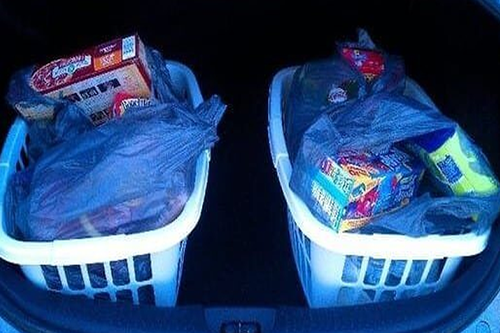 By putting a couple of laundry baskets in your trunk, you can place everything you need in them. Plus, you can just carry the baskets into the house with your groceries, rather than carrying six separate bags!