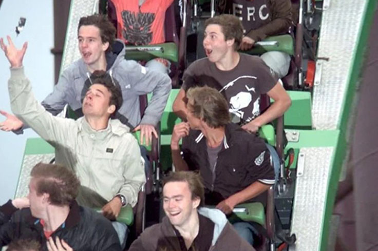 Just when you think you’ve seen it all on a roller coaster, someone catches a set of keys mid-air! The look of concentration and surprise on the rider’s face as he snatches the keys is priceless. His friends, equally amazed, can barely believe what they’re witnessing, adding to the photo’s comedic charm.