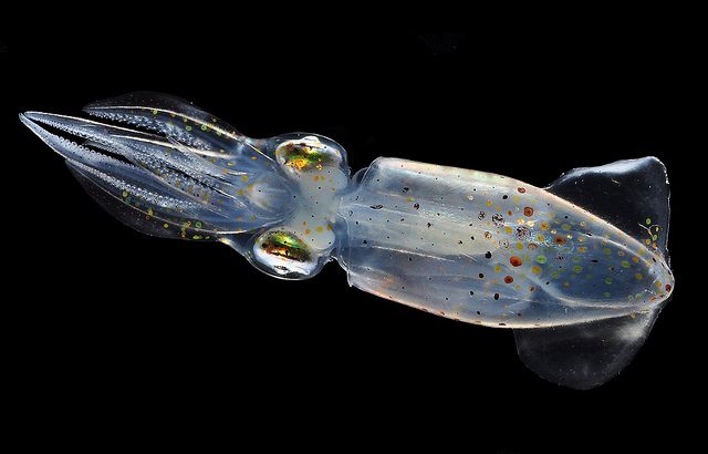 Habitat and Behavior:These squid are found in the mesopelagic to bathypelagic zones of the ocean. They feed on small fish and plankton and use their transparency and bioluminescence as defense mechanisms.