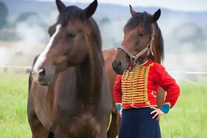 牧場で撮影されたこの写真は、思わず二度見してしまう完璧なタイミングが印象的です。華やかな赤い衣装を着た人が馬の隣に立つ瞬間、馬の頭と人の体がぴったり重なり、まるで馬が人間の体を持っているかのようなユーモラスな錯覚が生まれました。緑の牧草地と遠くに見える丘がのどかな雰囲気を醸し出す中、この一瞬が驚きと笑いを誘います。こんな偶然のタイミングが、穏やかな牧場の時間を特別なものに変える魔法のような一枚です。