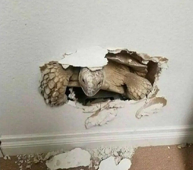 Turtles have always been known for their slow, steady pace. But imagine seeing one in mid-breakout, trying to escape its confines, like a real-life Teenage Mutant Ninja Turtle! This turtle didn’t think through its escape plan very well, as it got busted right in the middle of the act. Who knows—maybe it was just trying to save the world (or find some pizza).